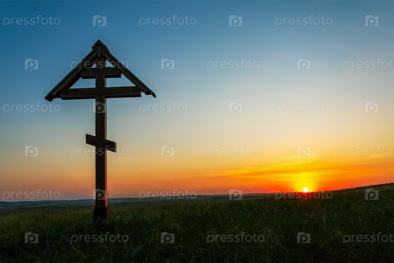 Деревянный крест на лугу на закате