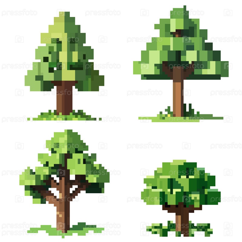 Зеленые пиксельные деревья в саду. Ретро 8-битная графика