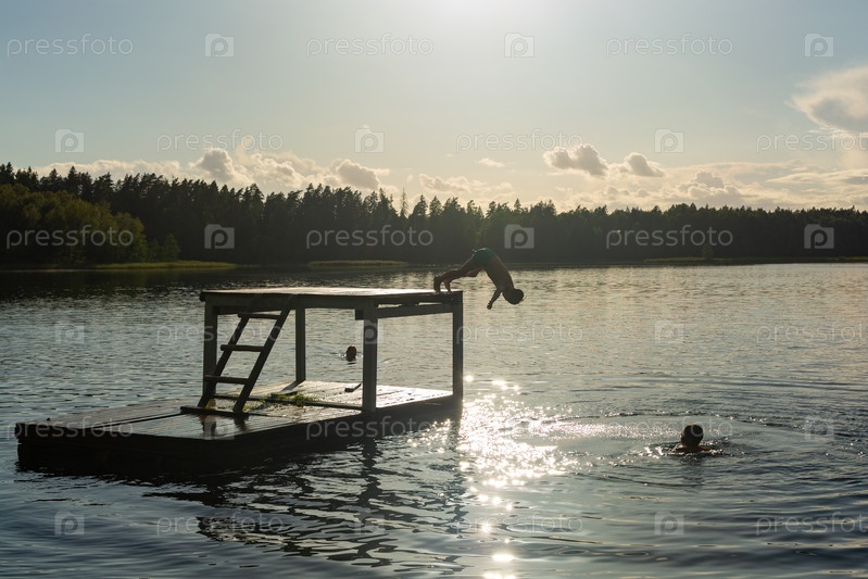 Подростки прыгают в воду озера во время летних каникул