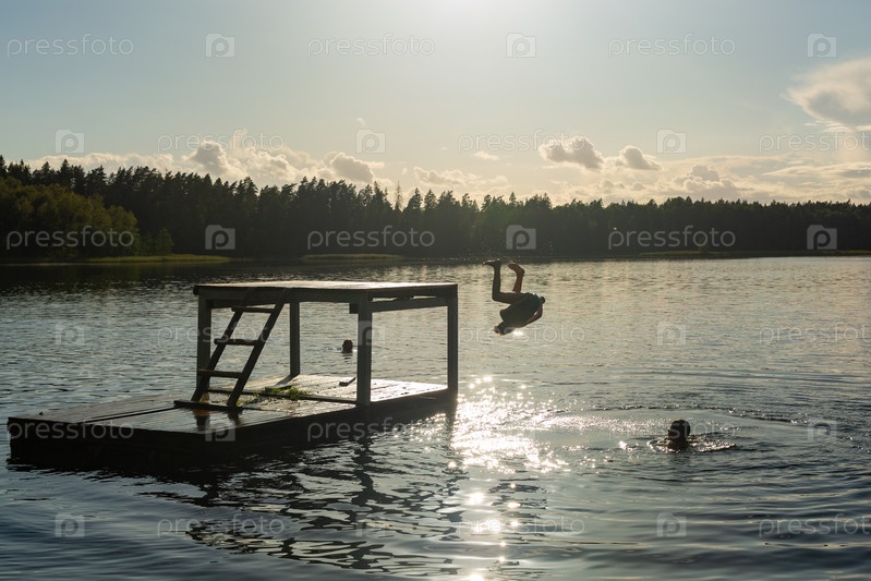 Подростки прыгают в воду озера во время летних каникул