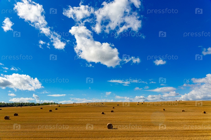 Собранные тюки соломы в поле в солнечный летний день. Урожай пшеницы рулоны соломы в поле после пшеницы, собранной в сельском хозяйстве, ландшафтная сельская сцена