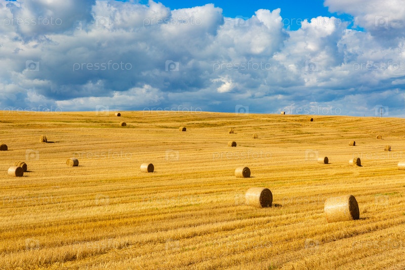 Собранные тюки соломы в поле в солнечный летний день. Урожай пшеницы рулоны соломы в поле после пшеницы, собранной в сельском хозяйстве, ландшафтная сельская сцена