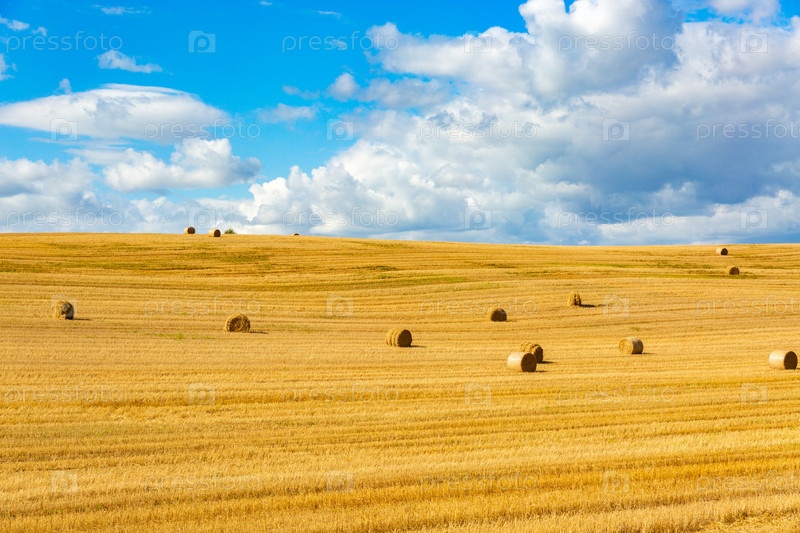 Собранные тюки соломы в поле в солнечный летний день. Урожай пшеницы рулоны соломы в поле после пшеницы, собранной в сельском хозяйстве, ландшафтная сельская сцена