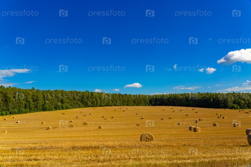 Собранные тюки соломы в поле в солнечный летний день. Урожай пшеницы рулоны соломы в поле после пшеницы, собранной в сельском хозяйстве, ландшафтная сельская сцена