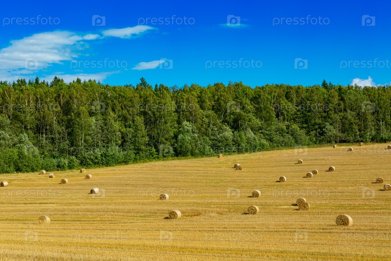 Собранные тюки соломы в поле в солнечный летний день. Урожай пшеницы рулоны соломы в поле после пшеницы, собранной в сельском хозяйстве, ландшафтная сельская сцена