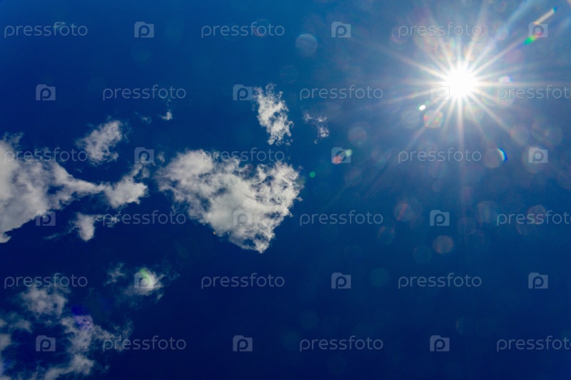 Голубое небо с облаками и отражением солнца. Солнце светит ярко днем летом