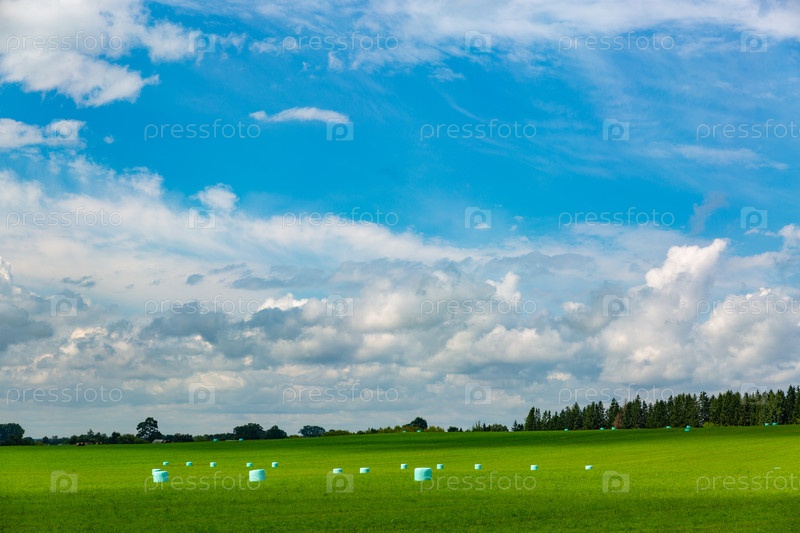 Белорусское сельскохозяйственное поле с тюками сена, завернутыми в зеленую пластиковую пленку
