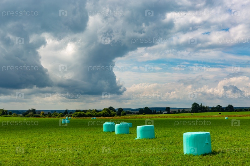 Белорусское сельскохозяйственное поле с тюками сена, завернутыми в зеленую пластиковую пленку