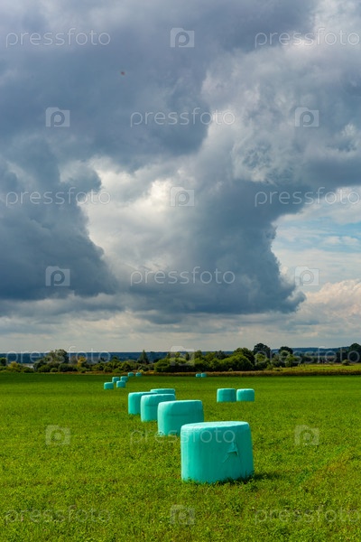 Белорусское сельскохозяйственное поле с тюками сена, завернутыми в зеленую пластиковую пленку