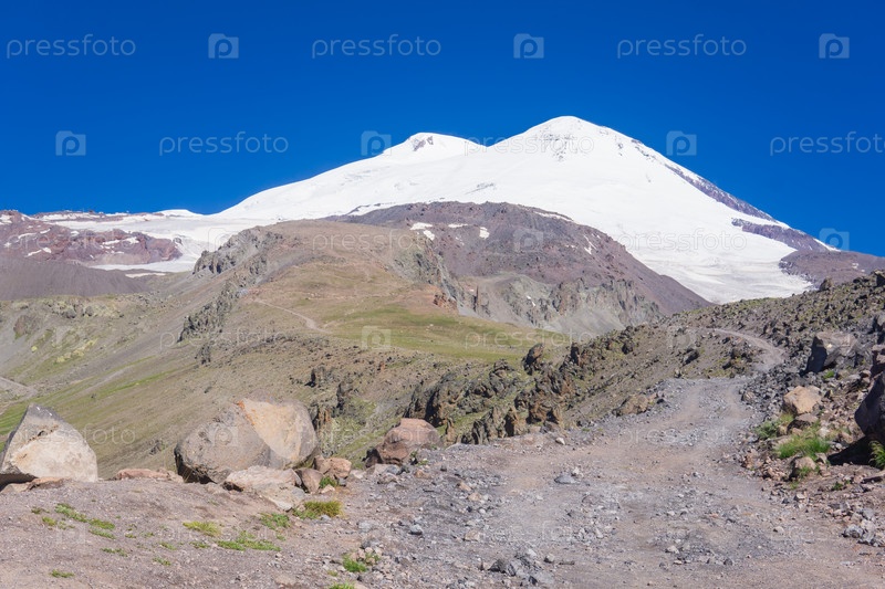 Высокогорный пейзаж, дорога через пустынное скалистое высокогорное плато и двойная вершина Эльбруса вдалеке