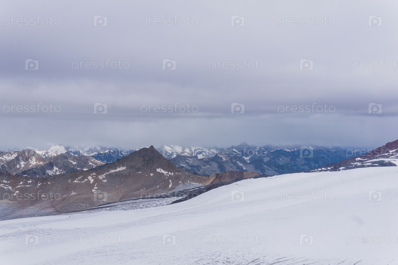 Вид на высокие горы над облаками с ледника на склоне Эльбруса