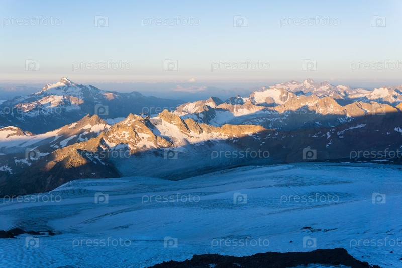 Горные вершины в утреннем свете рассвета, панорамный природный ландшафт