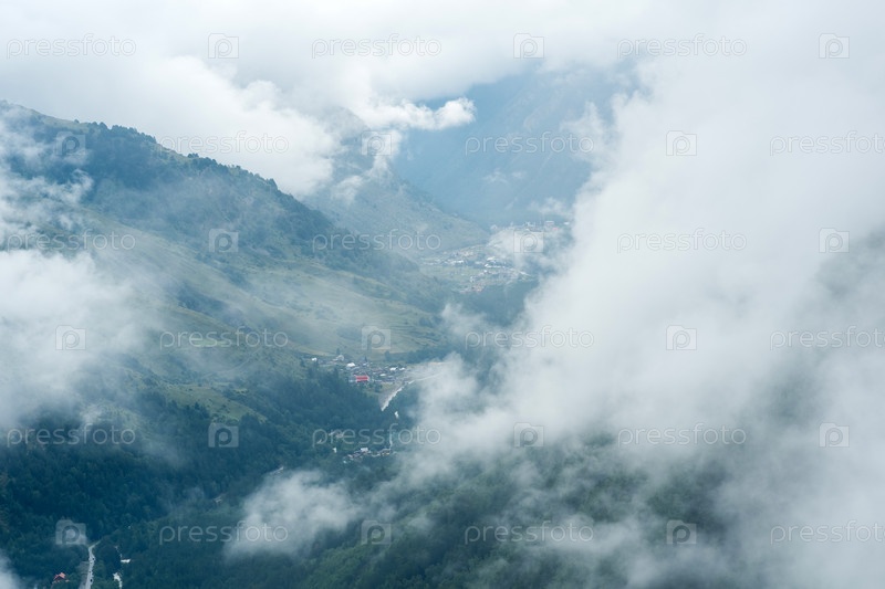 Вид сверху сквозь облака на долину с горными деревнями