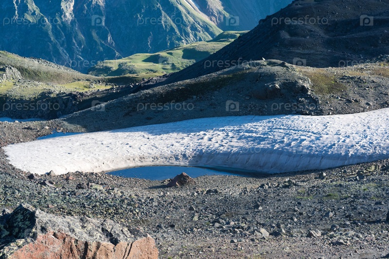 Горный ландшафт, скалистое ложе тающего ледника с талыми озерами