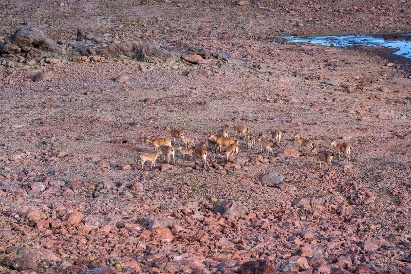 Стадо диких горных козерогов на оползне на месте растаявшего ледника в высокогорье