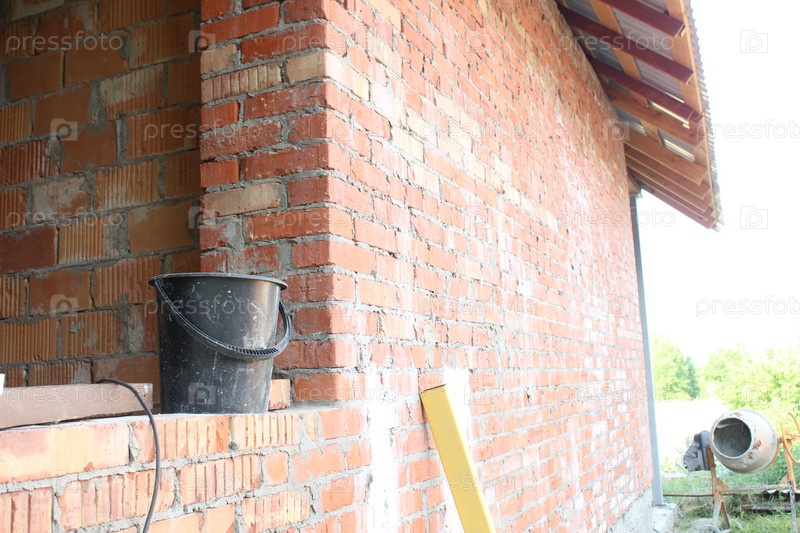 Строящееся здание. Процесс строительства кирпичного здания. Черное ведро в оконном проеме