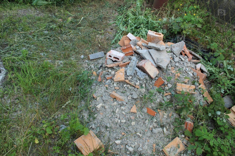 Выброшенные кирпичи и бетон на траве. Проблема утилизации строительных отходов и остатков строительных материалов