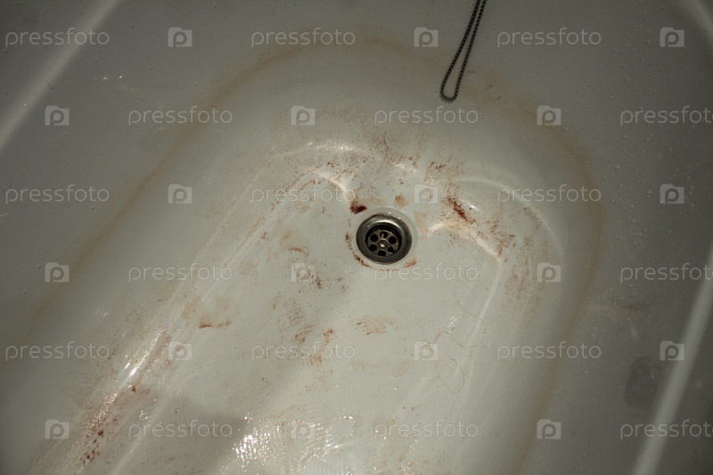 Ванна после мытья. Грязные разводы на белой пластиковой ванне. Необходимость чистки