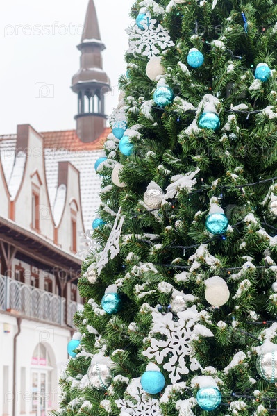 Новогодняя елка в городе. Белые и синие украшения на елке