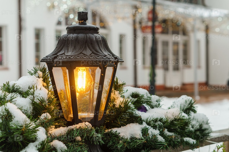 Декоративный фонарь с желтой лампочкой. Елочные игрушки и декоративный фонарь на улице. Украшение города к Новому году