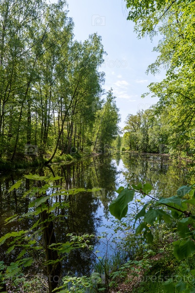Лесной пейзаж лето. Река в лесу. Отражение деревьев в реке
