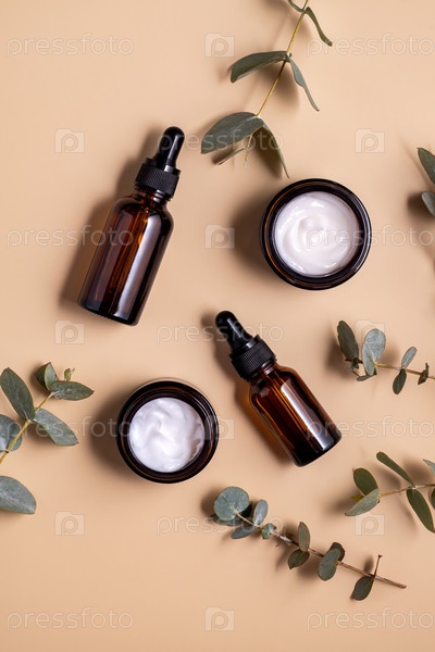 Коричневые стеклянные бутылки и ветки эвкалипта на бежевом фоне. Экологически чистая органическая натуральная косметика для ухода за кожей и телом. Копировать пространство