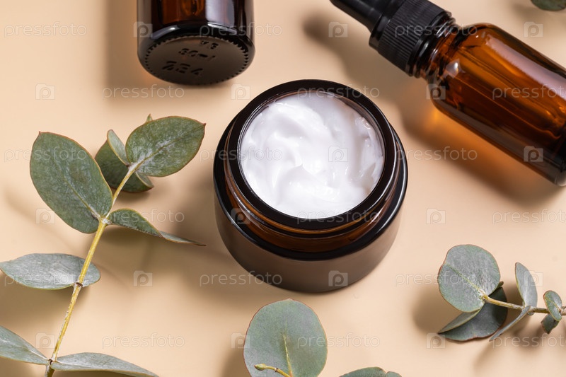 Коричневая стеклянная банка для крема на бежевом фоне с веткой эвкалипта. Концепция косметического ухода за кожей