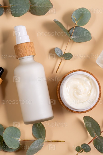 Естественная косметика в бамбуковой и стеклянной упаковках на коричневом фоне с цветами эвкалипта. Набор органических косметических средств SPA. Концепция ухода за кожей