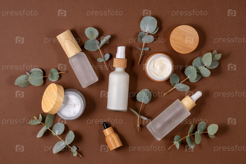 Антивозрастная коллагеновая сыворотка для лица в стеклянной бутылке и крем для лица на коричневом бумажном фоне с ветвями эвкалипта. Натуральная органическая косметическая концепция красоты. Вид сверху