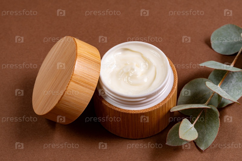 Крем для лица или тела в бамбуковой банке с натуральными экстрактами и маслами эвкалипта. Косметика для ухода за кожей. Лечение травами