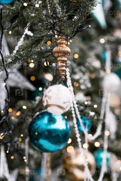 Красивые праздничные украшения на елке. Крупный план. Красивый рождественский фон. Концепция украшений и декора на новый год. Новогодняя открытка 2025