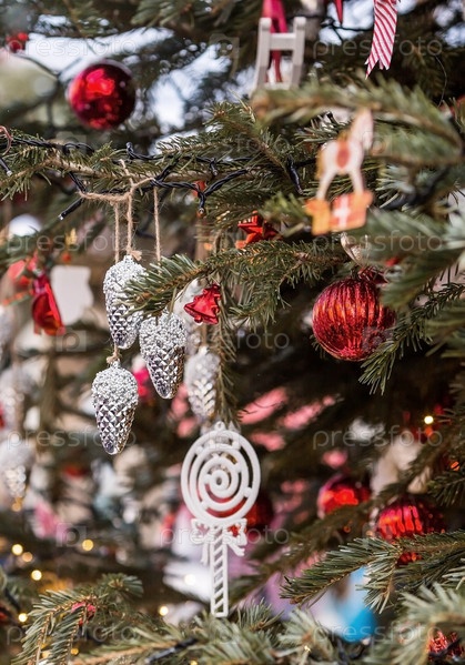 Красивые праздничные украшения на елке. Крупный план. Красивый рождественский фон. Концепция украшений и декора на новый год. Новогодняя открытка 2025