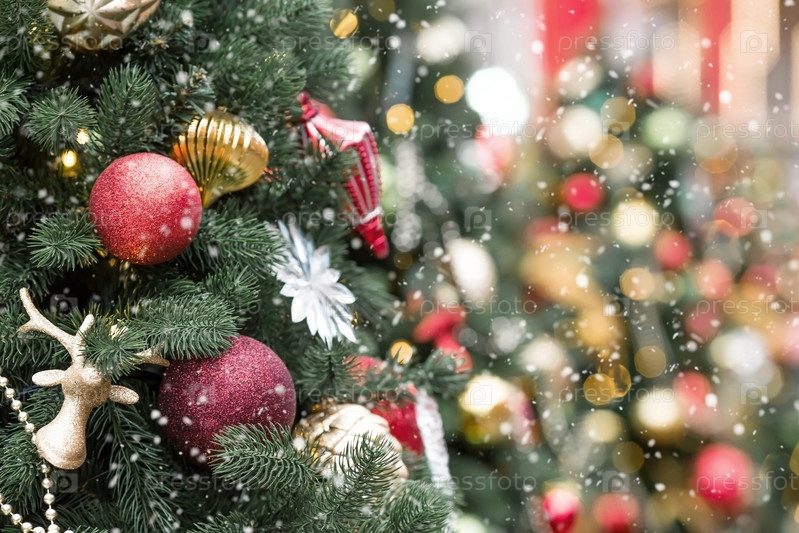 Красивые праздничные украшения на елке. Крупный план. Красивый рождественский фон. Концепция украшений и декора на новый год. Новогодняя открытка 2025
