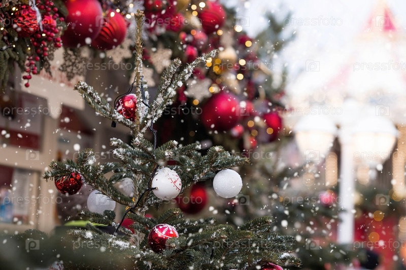 Красивые праздничные украшения на елке. Крупный план. Красивый рождественский фон. Концепция украшений и декора на новый год. Новогодняя открытка 2025