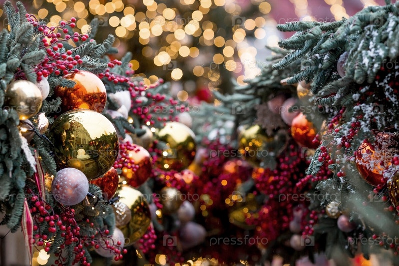 Красивые праздничные украшения на елке. Крупный план. Красивый рождественский фон. Концепция украшений и декора на новый год. Новогодняя открытка 2025