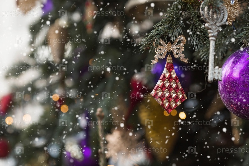 Красивые праздничные украшения на елке. Крупный план. Красивый рождественский фон. Концепция украшений и декора на новый год. Новогодняя открытка 2025