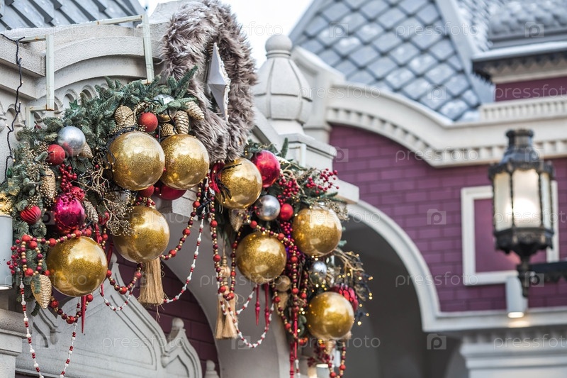 Новый год 2025. Новогодние украшения и игрушки на улицах города. Рождественские праздники, зимний новогодний декор в центре Москвы