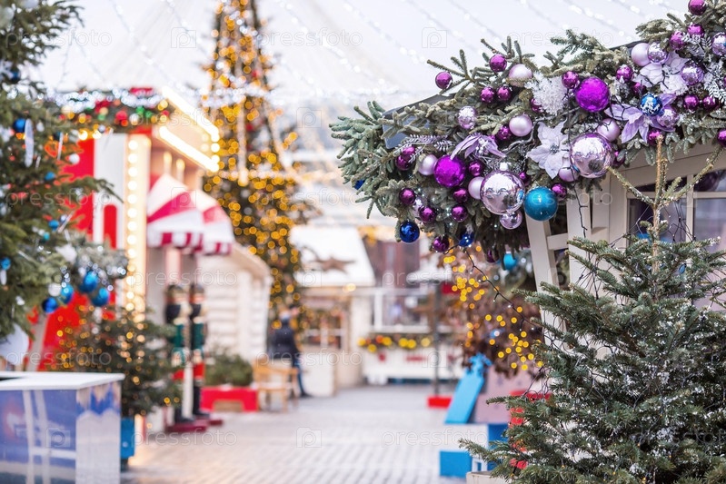 Новый год 2025. Новогодние украшения и игрушки на улицах города. Рождественские праздники, зимний новогодний декор в центре Москвы