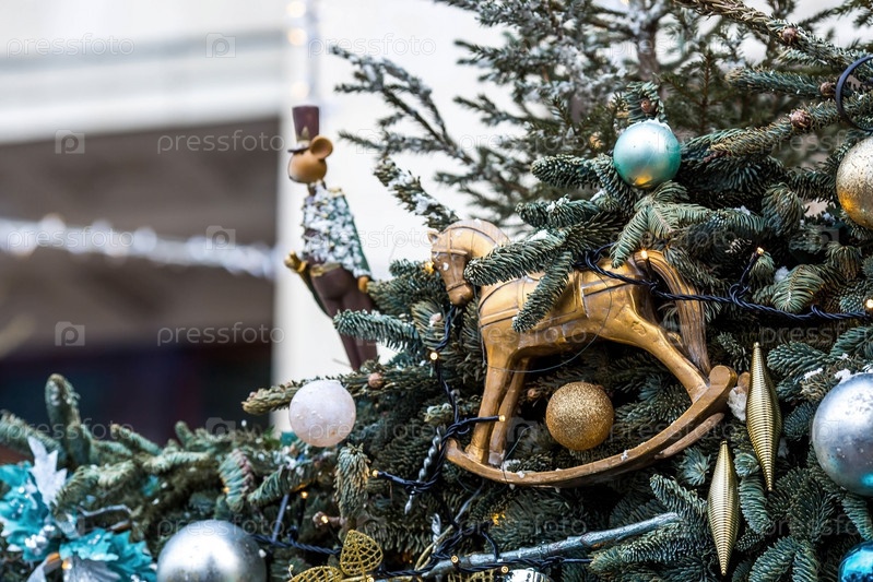 Новый год 2025. Новогодние украшения и игрушки на улицах города. Рождественские праздники, зимний новогодний декор в центре Москвы