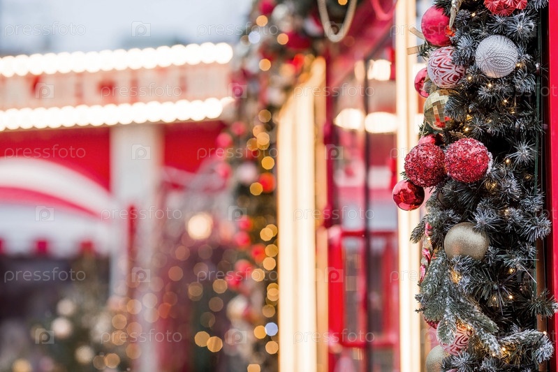 Новый год 2025. Новогодние украшения и игрушки на улицах города. Рождественские праздники, зимний новогодний декор в центре Москвы
