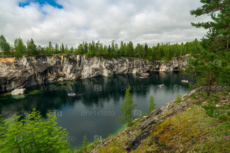 Лодки на Мраморном озере в горном парке Рускеала в Карелии, Россия