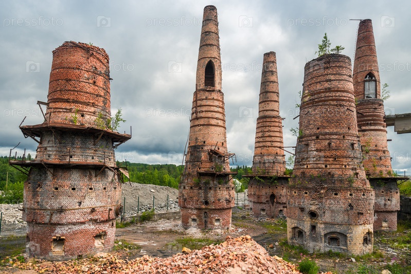 Старые кирпичные трубы заброшенного мраморного завода в Рускеала, Республика Карелия, Россия