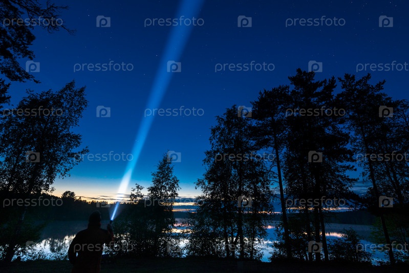 Луч фонаря освещает звездное небо с соснами ночного леса