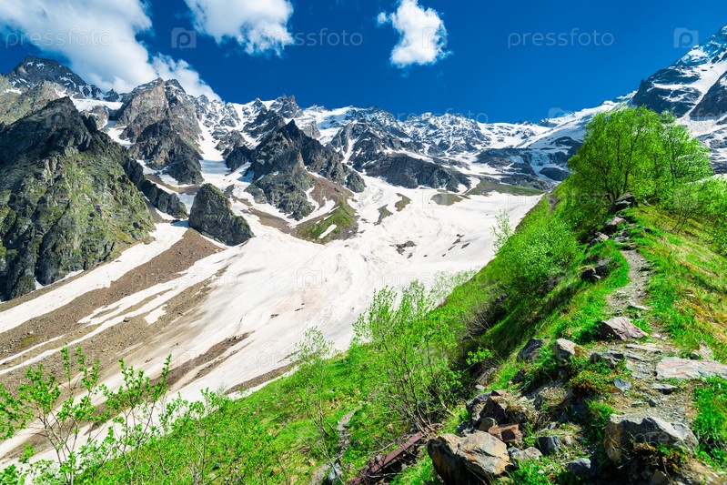 Узкая горная тропа вдоль зеленого холма на фоне заснеженных скалистых склонов бассейна ледника Сказский. Северный Кавказ