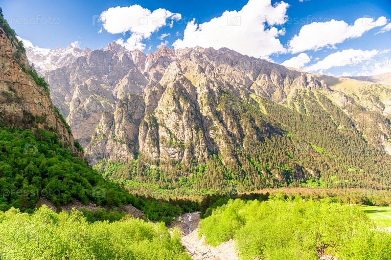 Красивая скалистая гора и горная река Северного Кавказа в ясную погоду. Россия