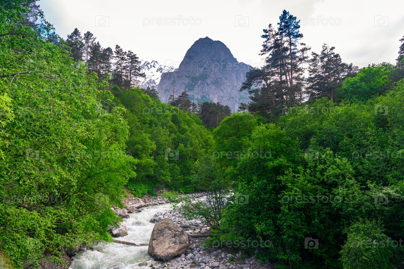 Бурная, стремительная горная река на фоне гор Северного Кавказа. Россия