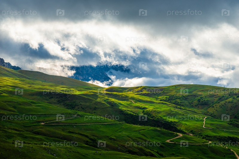 Живописные горы в прекрасных облаках Северного Кавказа. Россия