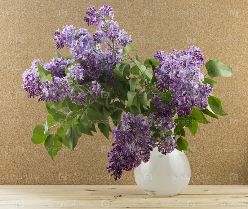 Букет сирени в белой вазе на деревянной поверхности