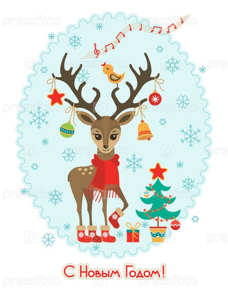 Милая новогодняя открытка с изображением оленей, елки и надписью: ' С Новым годом ! 'ute Happy New Year greeting card