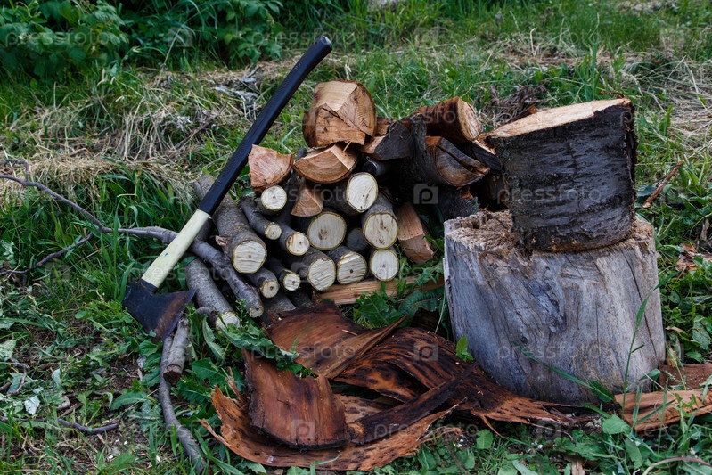 Распиленные стволы грецкого ореха, колотая древесина вишни, пень и топор